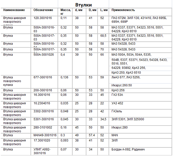 Таблица размеров шкворней и втулок: